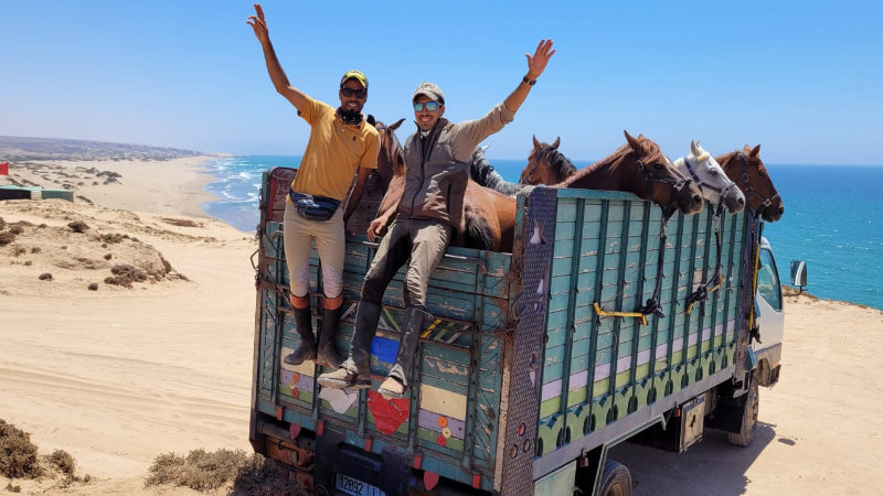 Dag 6. Dagen börjar med att ni passerar genom palmlunden. Ni rider bland grödor och vackra skuggade stigar till en by med utsikt över Massa-oasen. Därefter möter ni den fantastiska stranden Sidi R'bat, där ni kan njuta av en spännande galopp innan ni kommer till picknickplatsen nära fiskarnas hus. Efter lunch kommer hästarna att lastas på lastbilen för hemresan, medan ryttarna kommer tillbaka i 4x4-fordon. Vid ankomsten till ranchen kommer alla att delta i skötseln av hästarna.