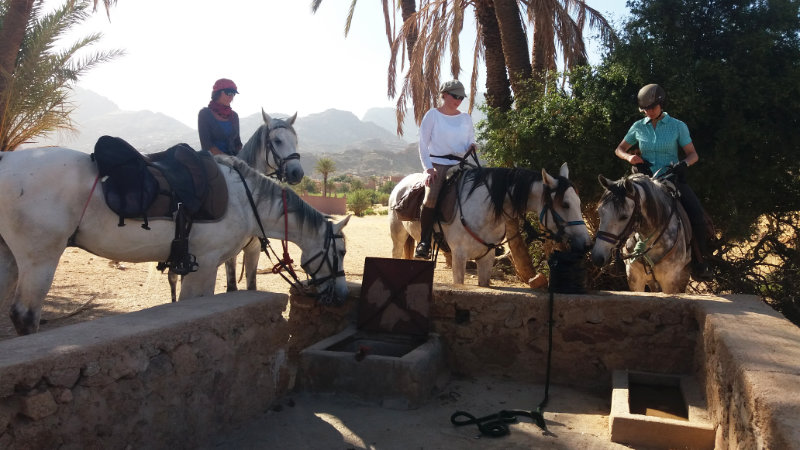 Dag 5. Från grottorna fortsätter ni på vackra sandspår på toppen av klippan med utsikt över vågorna. Lunch. På eftermiddagen får ni njuta av mjuka galopper genom sandöknen innan ni rider mot palmlunden. När ni närmar er Massa upptäcker ni ett oväntat och frodigt grönt landskap från en högre utsiktspunkt. På kvällen kommer ni fram till ett bekvämt hotell i Massa palmlund, där ni kan ta en uppfriskande simtur i poolen eller upplev en traditionellt hamam (hamam reservation krävs, minst 3 pers).