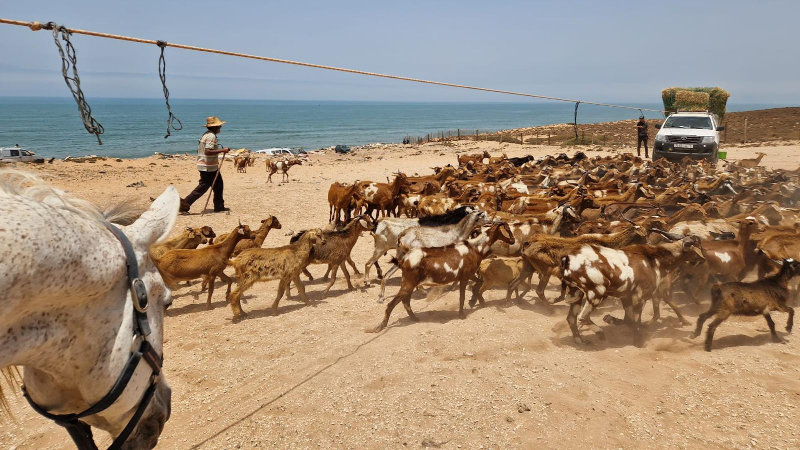 Dag 2 – Ranch – Laouina -Efter en god frukost förbereder ni era hästar och lämnar ranchen för denna första riddag. Färden går mot bergen som reser sig ovanför ranchen och havet. Ni passerar berberbyar och möter herdar med sina hjordar. Ni njuter av en picknick under arganträden. På eftermiddagen lämnar ni bergen med en fantastisk utsikt över Tiznit-slätten. Mellan jordbruksmarker och wadier följer ni bra ridvägar som möjliggör lite högre tempo. Kväll och natt tillbringas hos en lokal familj där ni får upptäcka berberkulturen och deras sätt att leva.