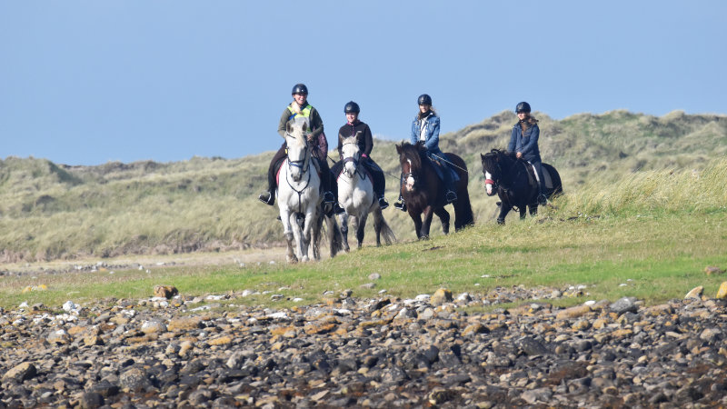 Denna dag är alla ryttares dröm; upptäck de orörda och vidsträckta stränderna på hästryggen! Det kombinerar fartfylld ridning på den vidsträckta stranden nära Streedagh-stranden där 3 Armada-skepp sjönk 1588 och en naturskön skritt över ön med en picknick bland hästarna eller ett stopp i byns kafé för mat (tidvattnet avgör vilka alternativ fungerar bäst). Känn spänningen av att korsa en atlantisk kanal till O'Connor's Island, sälar och flyttfåglar kan ofta ses i lagunen. Ni kommer in i den magiska världen på familjens privata ö och ni får se deras gamla hembygd. Följ de smala stigarna när du korsar konturerna av det stora sanddynsystemet, där natursköna utsiktspunkter dyker upp mellan sandkullarna. 360 grader av fantastisk utsikt vid horisonten – det är vackert. Detta område med särskilt bevarande är rikt på biologisk mångfald, bara de tuffaste växterna överlever exponering för de salta vindarna här, så det påminner om de vilda blomsterängarna i de höga alperna. Familjens boskapsbesättning strövar omkring på ön och du kanske träffar några hästar på deras semester vid havet. Din häst kan njuta av det salta ö-gräset medan du kopplar av, ta ett mellanmål bland hästarna och utforska platserna för det gamla gårdslivet på ön. Avgångstid beror på tidvattnet.