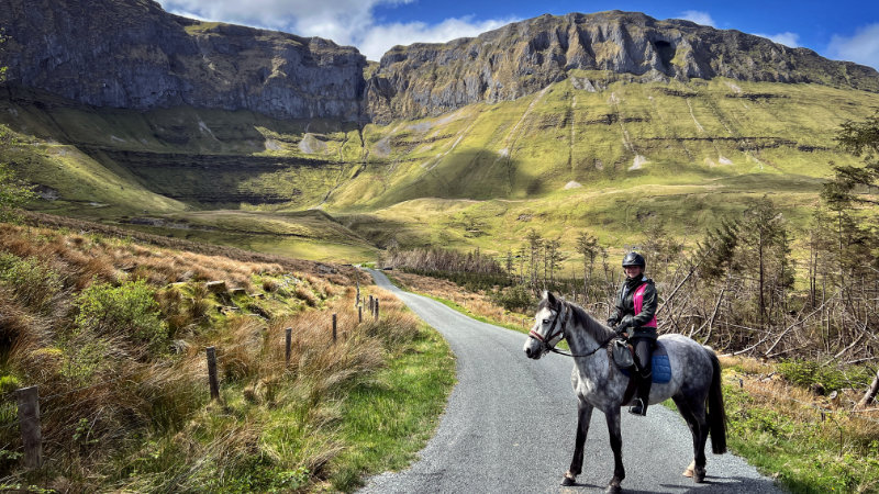 ALTERNATIV A: Det här är en låååång tur med spektakulära vyer, men också massor av skritt på asfalterade vägar! Några mil inåt landet från kusten rider ni den karga Gleniff Horse Shoe-dalen (framröstad till attraktioner som nr 1 i Ballintrillick av Trip Advisor) inbäddat under Benwiskin Mountain.