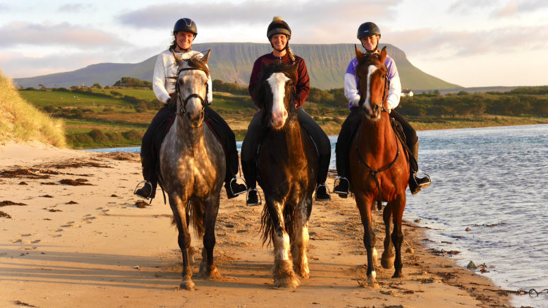 Dag 2 Tisdag. Efter att ha lärt känna din häst med en ridlektion kommer ni att rida på en 2-3 timmars strand- och myrtur. Den kombinerar kust- och landsbygdsupplevelser: ridning vid havet och ridning på den irländska landsbygden. Den första delen tar er längs den Trawalua-stranden. Sedan följer ni lugna stigar och sekelgamla myrspår vid foten av det karga berget Benbulben. Lunch är på gården.